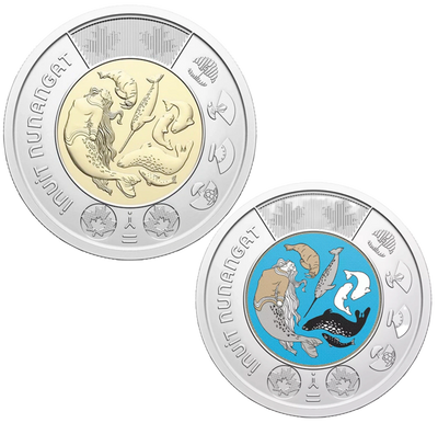 With other Inuit artists from Nunatsiavut, Nunavut, Inuvialuit Settlement Region, I took part creating the the Inuit Nunangat coin is a 2024 Canadian $2 circulation coin celebrating the Inuit homeland. The reverse shows Nuliajuk surrounded by marine animals and four regional uluit symbolizing unity, culture, and connection to the land and sea.